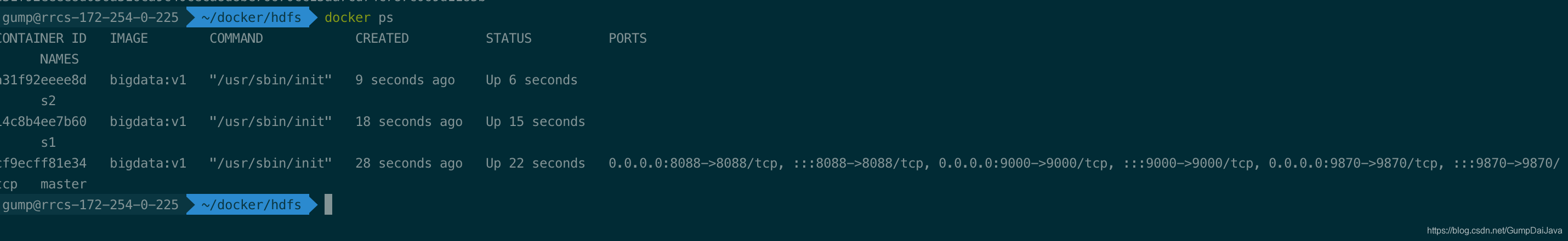 -v /Users/gump/docker/hdfs/master:/opt/hdfs 这个非常重要,每个节点都有一个属于自己的目录, 如 master /Users/gump/docker/hdfs/master