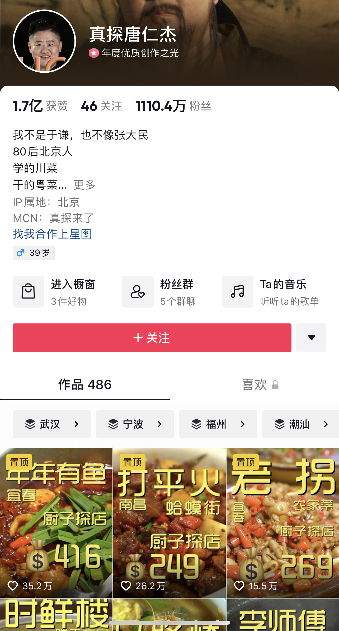 以过去一年热度极高的头部探店博主“真探唐仁杰”为例,目前其抖音粉丝已超1100万,在B站拥有约350万粉丝。其视频主打唐仁杰的厨师身份,内容多从专业视角分析菜肴的原料、做法和口味,很受用户欢迎。该博主真正破圈的热度正是来自收费推广问题引起的争议。