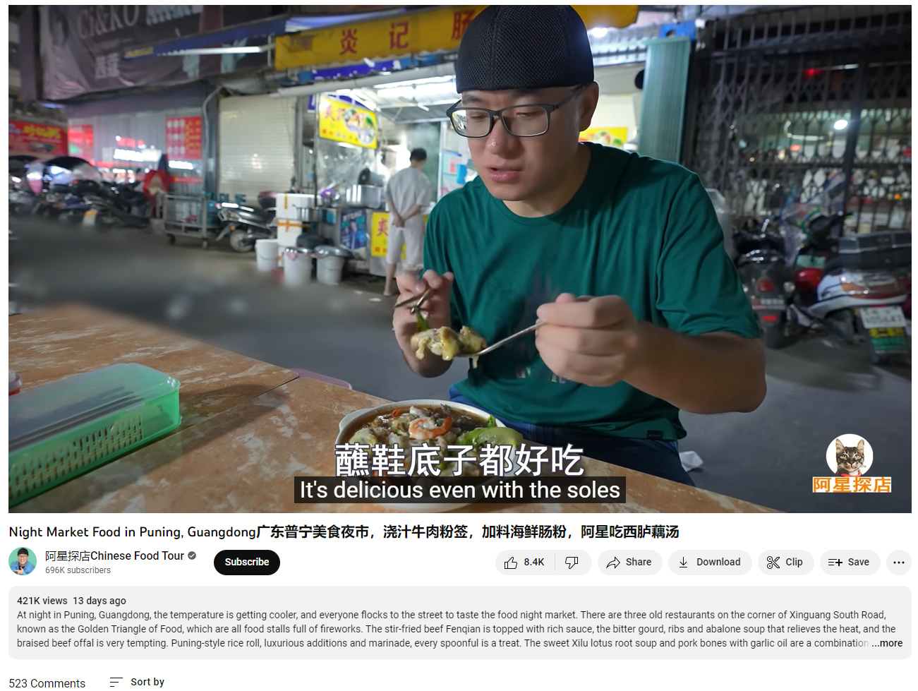相较之下,国外探店不易受地域限制,氛围也没那么卷,节奏相对更慢。比如YouTube上颇受欢迎、拥有约80万粉丝的中国探店博主“阿星探店”。该博主在B站的账号有60万粉丝,但B站视频播放量大多在二三十万,个别爆款破百万,而在YouTube上,他的不少视频有两三百万播放量,且有大量国外网友留言称喜欢这种节奏不快、在探店同时介绍当地风土人情的视频。