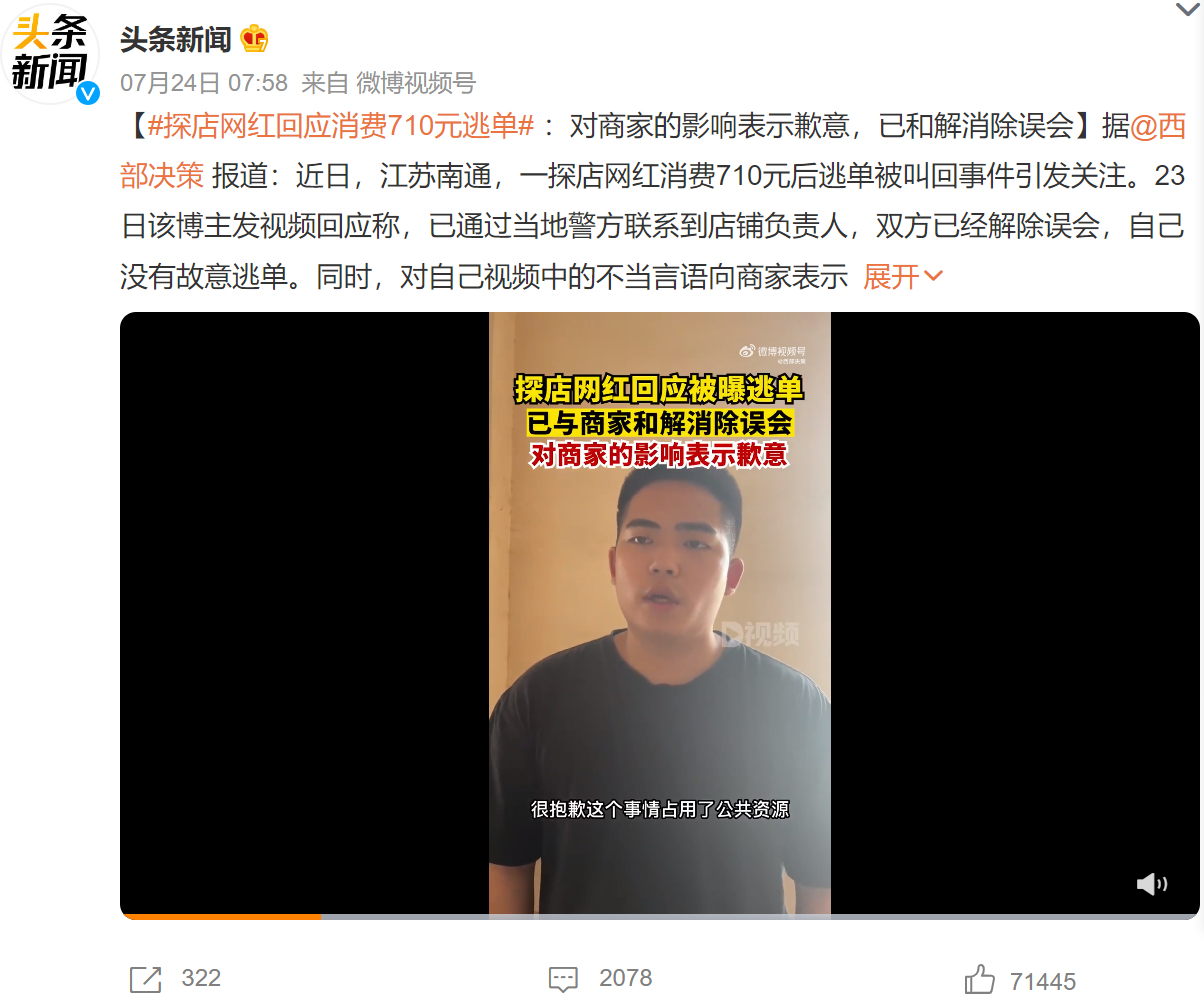 2022年7月,江苏南通就有一位探店博主消费710元,不付款便想离开,直到被服务员叫住才支付费用。该博主发布了针对店铺进行负面评价的视频后,相关消费过程被公开,“探店网红回应消费710元逃单”冲上热搜。