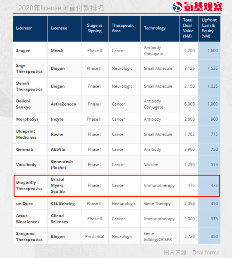 而在百时美施贵宝与Dragonfly的交易中,首付款为4.75亿美元。这是什么概念?在2020年全球生物制药license in的排行榜中,4.75亿美元的首付款排名第九。