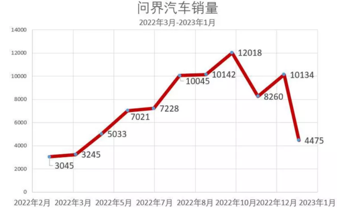 2022年3 月起,问界系列月销售量持续攀升,8 月首次过万辆,但之后就慢了下来,9月份基本没增长,10月份环比增长20%达到12018辆,11月份环比下跌31%后只有8260辆,进入12月份又环比增长23%达到9月份水平。