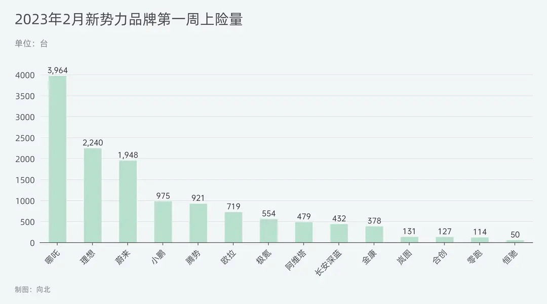 进入2023年,问界又率先响应特斯拉价格战,M5、M7三款车型最高降价3万元。但爬坡态势却戛然而止,今年1月问界销量、上险量就被深蓝、极氪抛下。进入2月第一周,上险量更是被HI模式主导的阿维塔反超——要知道,阿维塔1月上险量仅是微不足道的297辆。