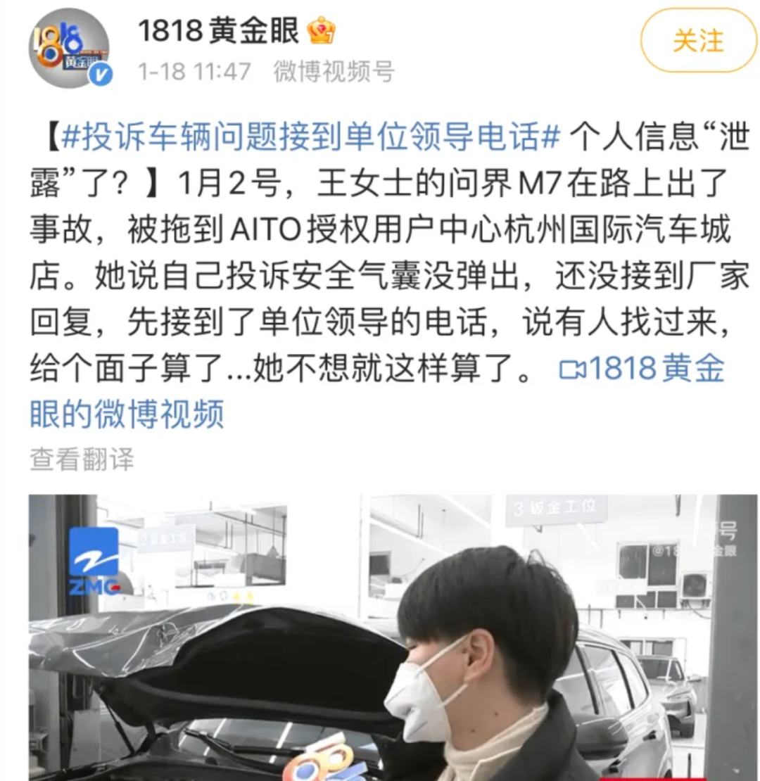 1月18日,《1818黄金眼》报道称,车主王女士购买的问界M7以80公里每小时时速撞向前方车辆,车辆安全气囊未弹出。随后王女士向厂家投诉。