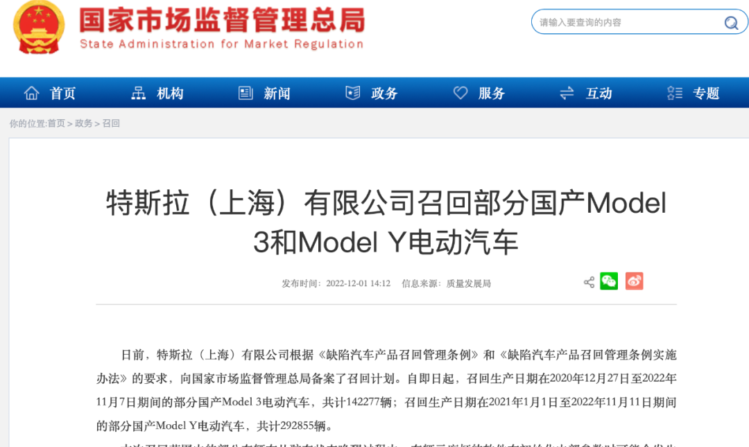 12月1日,特斯拉(上海)又宣布召回超43万台汽车,国家市场监督管理总局官网显示,特斯拉拟自即日起,召回生产日期在2020年12月27日至2022年11月7日期间的部分国产Model 3电动汽车,共计142277辆;召回生产日期在2021年1月1日至2022年11月11日期间的部分国产Model Y电动汽车,共计292855辆。