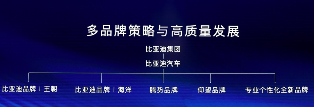 根据亚迪对外展示的规划,比亚迪将形成比亚迪王朝、比亚迪海洋、腾势、仰望,以及专业个性化全新品牌的全阶梯覆盖。从家用到豪华、从大众到个性化,比亚迪全部可以满足。