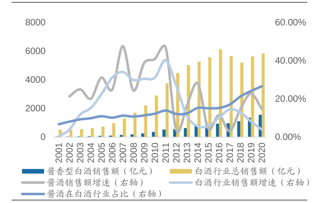 首先,酱酒领军企业的带动,扩大了整个酱香型白酒的市场容量。从下图可以看出,进入到茅台时代以后,随着飞天茅台一瓶难求的趋势影响,整个酱香型白酒市场容量在不断突破新高。