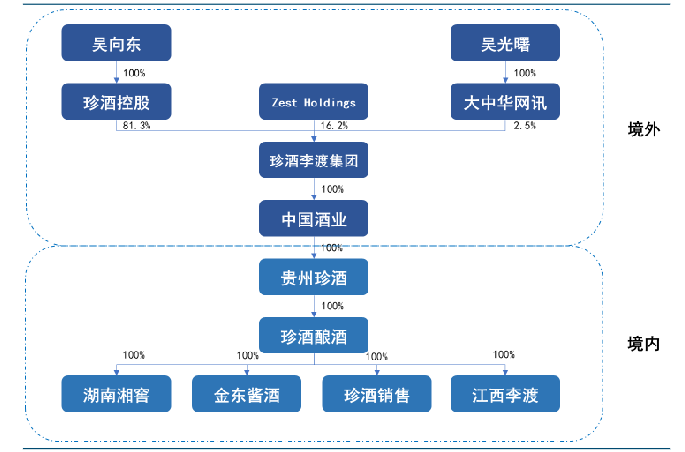 在股权架构上,根据招股书披露,珍酒控股(英属处女群岛)持有珍酒李渡81.3%的股份,Zest Holdings持股16.2%,大中华网讯持股2.5%。其中珍酒控股由吴向东全资拥有。