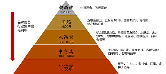 其次,看价格。大家习惯用价格对白酒上市公司进行高、中、低几个档次的划分。如下图所示,在塔尖的位置是价格大于2000元的白酒,这个价格带的规模性销售就是飞天茅台一家。