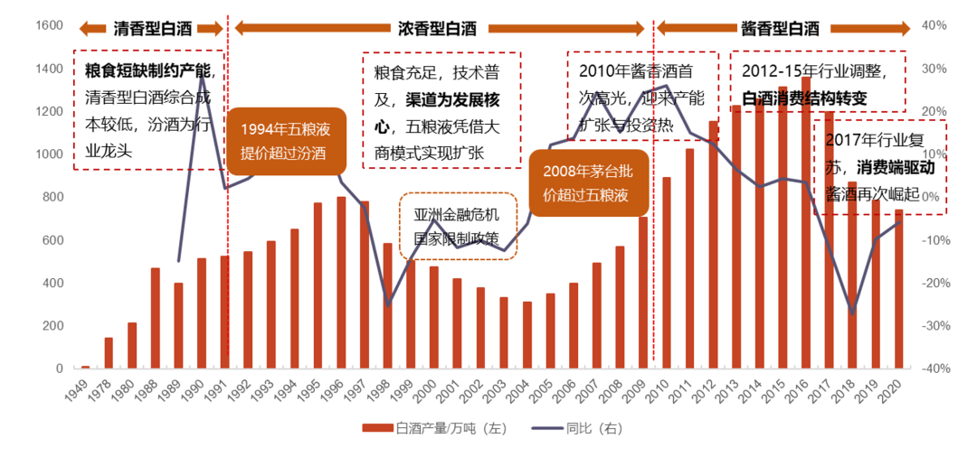 第一个10年:70——80年代。这个时期由于经济条件制约,粮食的产量也不是很高。于是,以低成本为主要特征的清香型以及代表企业山西汾酒脱颖而出。