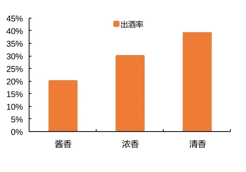 其次,酱香型白酒的酿造工艺决定了其市场供应。在白酒酿造中,不同工艺下的出酒率是不同的。酱香型白酒因其复杂的工艺,出酒率会低一些,由此也决定了高端酱香白酒的产能供应。