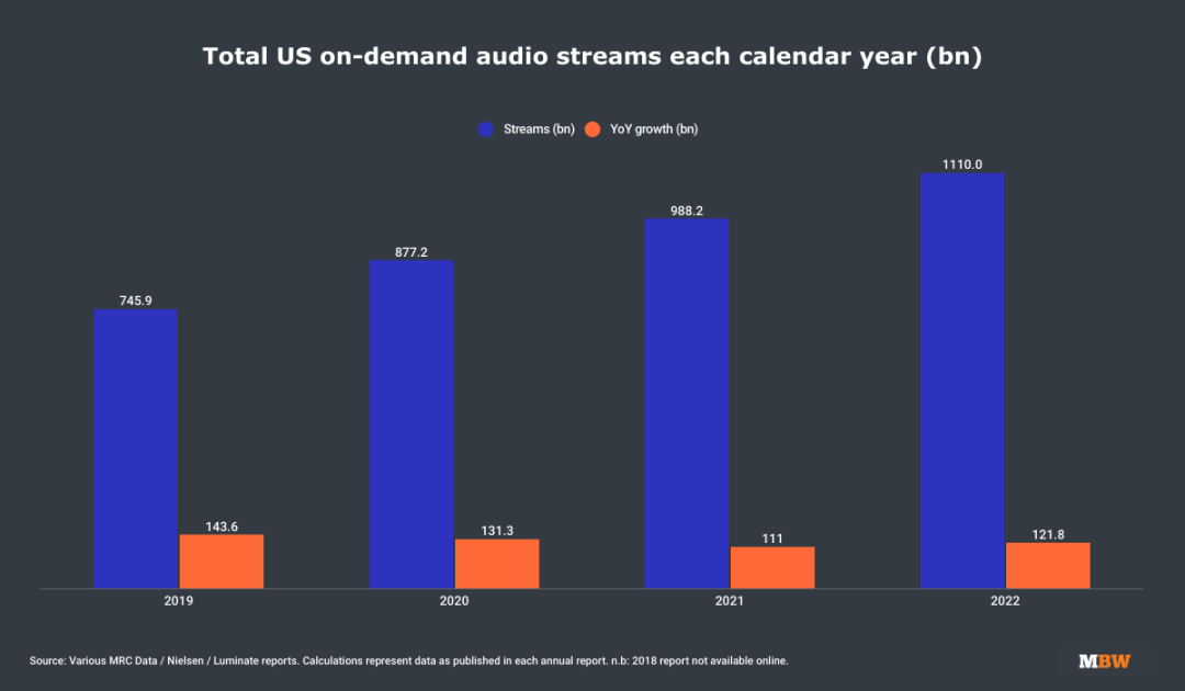 据Luminate最新的年度报告,2022年美国音频点击播放量增长了12.1%,至1.1万亿,2022年总流量同比增长1218亿。与此同时,美国年度十大热门歌曲的受欢迎程度正在下降:2022年,美国前10热门歌曲播放量总计47.23亿次,低于2021年的52.74亿次,2020年的59.67亿次,甚至低于2017年的49.17亿次。