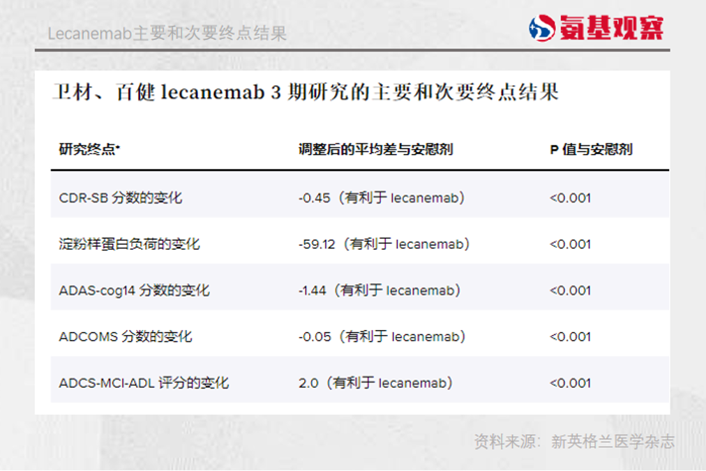 结果显示,Lecanemab成功达到了临床终点。具体来看,lecanemab的临床三期试验,使用的是全球认知和功能量表CDR-SB做为主要终点。