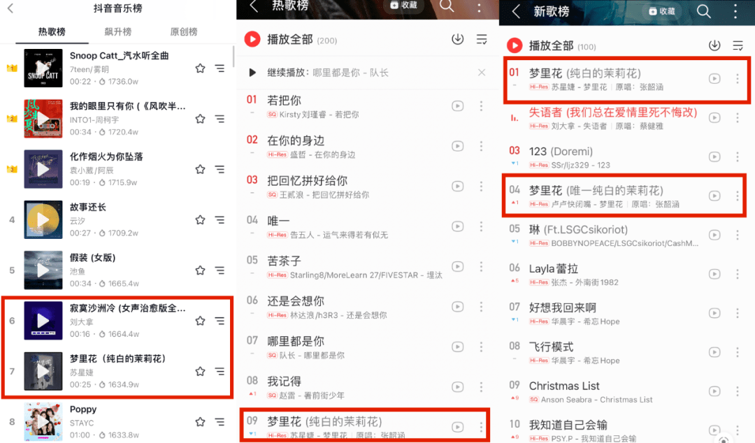 分别打开抖音、网易云的音乐热歌/新歌榜,我们会发现,苏星婕翻唱版《梦里花》、刘大拿翻唱版《寂寞沙洲冷》都多次闯入到TOP10,那句被张韶涵在08年唱火的“唯一纯白的茉莉花”如今正响彻抖快。