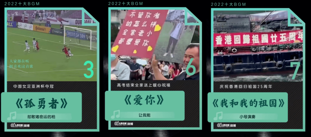 老歌回潮是社会情绪的集中折射,最近微博热议的人民日报官评的 #2022十大BGM# 就揭示了老歌触动国人共鸣的那些2022瞬间:《孤勇者》被广泛用来歌颂平民英雄,《爱你》是家人送给高考学子的暖心勉励,《我和我的祖国》则是记录北京冬奥、香港回归25周年等大事件的声音载体。