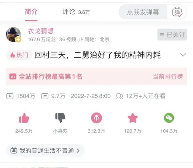 也靠着80多万的粉丝,接到了第一个广告。不过,89.9万是发布《回村三天,二舅治好了我的精神内耗》之前的粉丝数。视频发布仅一天,截至7月27日0点,“衣戈猜想”的粉丝数已增至167.6万。4个小时前,这一数字还是148.3万。