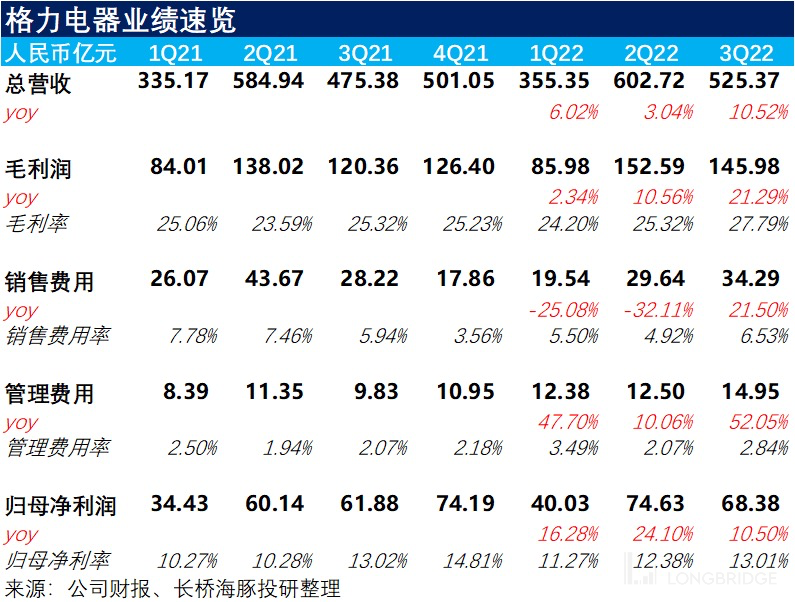 $格力电器.SZ(000651.SZ)北京时间 10 月 30 日周五下午发布今年三季度财报。2022 年前三季度营业总收入 1483.44 亿元,同比 +6.30%;归母净利润 183.04 亿元,同比 +17.0%;扣非归母净利润 185.67 亿元,同比 +25.77%。收入与市场此前的预期比较一致,需要注意的是,前三季度累计归母净利润增速快于收入增速,这里面主要的贡献是今年一二季度,营业利润率或者归母净利率和同期相比有小幅提升,但是单三季度由于费用率的提升,消化了部分毛利率改善的影响,归母净利润增速与收入比较一致,没有拉开明显的差距。