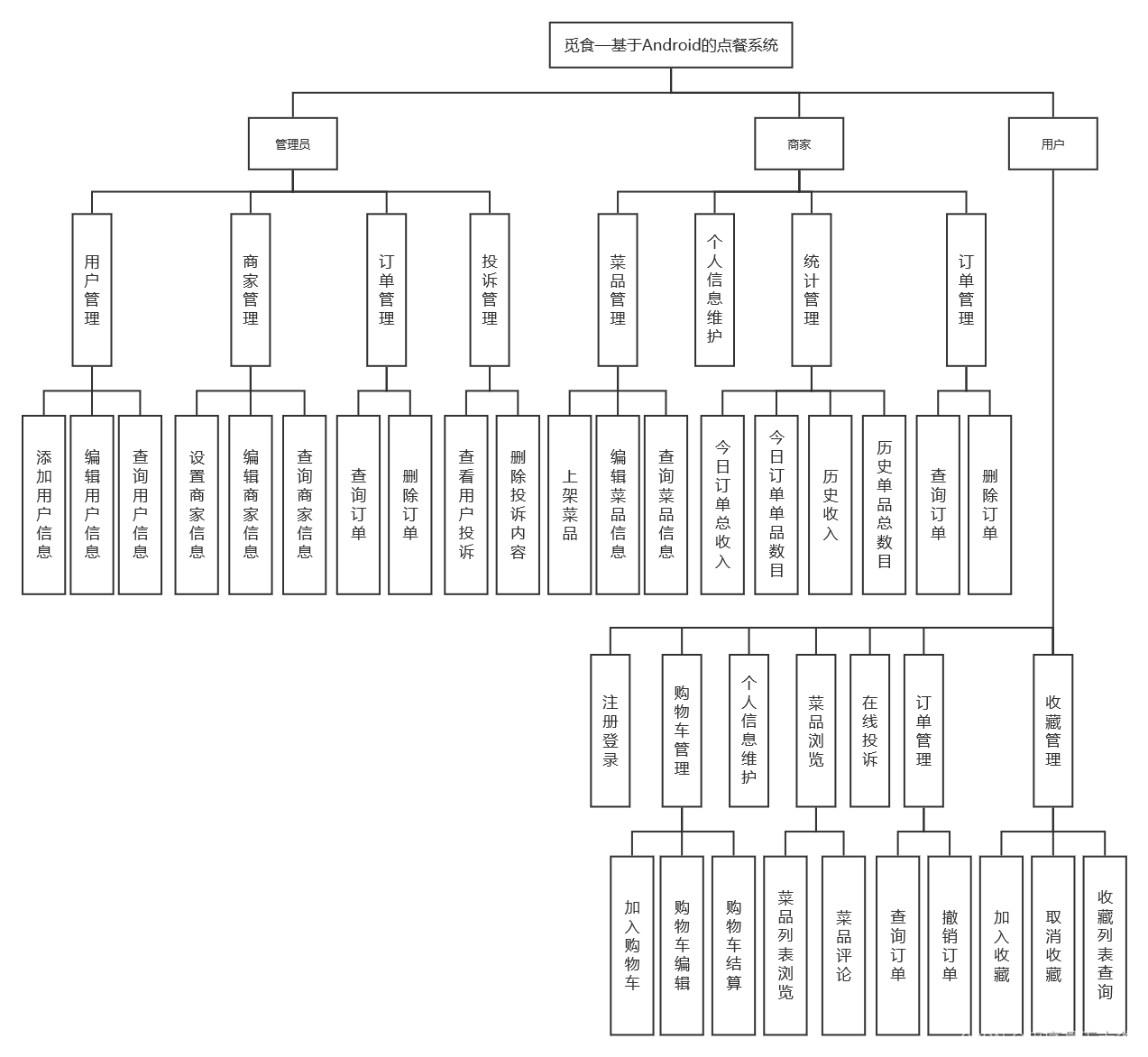 该点餐系统的主营业务是销售饭店菜品。使用B/S的开发模式,Java技术,并结合Spring Boot框架,数据库使用MySQL,前端使用Andorid技术进行开发。根据使用的用户角度分析,将从两大模块进行设计,分别为后台管理模块和网站前端用户模块。后台管理包括系统管理员和商家两个用户角色,其中,系统管理员包括用户管理,商家管理,订单管理,投诉管理四大功能模块;商家包括菜品管理,订单管理,统计管理,个人信息管理四大功能模块;而系统用户包括注册与登录,菜品浏览,购物车管理,订单管理,收藏管理以及个人信息维护。通过前后台的密切联系,共同构建成一个完整的点餐系统。