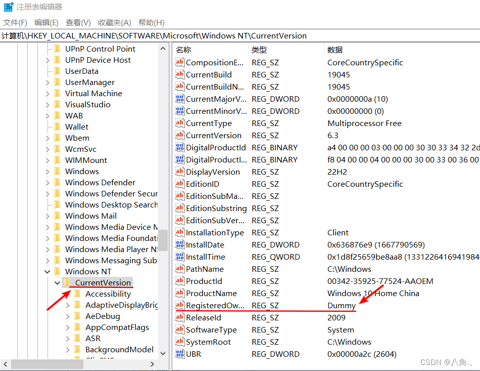 计算机\HKEY_LOCAL_MACHINE\SOFTWARE\Microsoft\Windows NT\CurrentVersion
