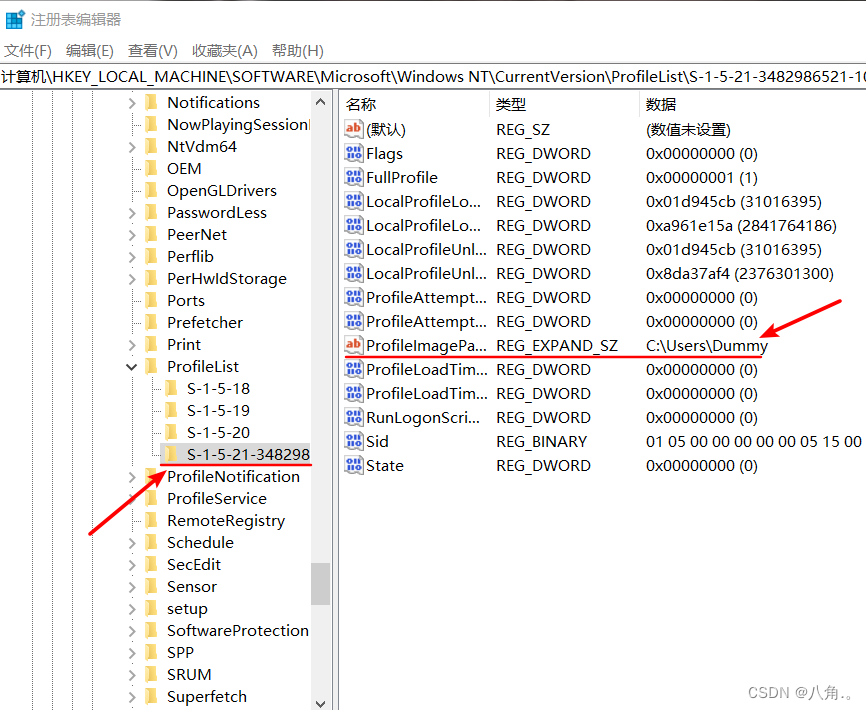 计算机\HKEY_LOCAL_MACHINE\SOFTWARE\Microsoft\Windows NT\CurrentVersion\ProfileList