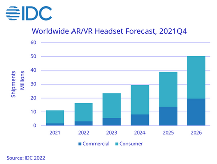 IDC数据显示,2021年AR/VR头显市场同比增长92.1%,并预计2022年出货量将增长46.9%,一直到2026年都将保持两位数增长率。