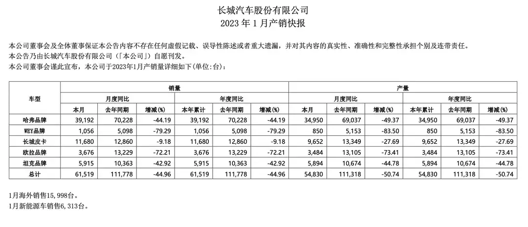 从SUV销量总量来看,与比亚迪的差距越来越大,且长安与吉利也已经呈现超越之势,SUV又是长城的核心腹地与大本营,毕竟,别的车企还有轿车,长城只有SUV,根据长城产销快报,2023年1月,整个哈弗品牌下跌了44%,可以说长城越来越危险了。长城SUV走到今天的局面,要反思的地方太多,留给长城调整的时间不多了。
