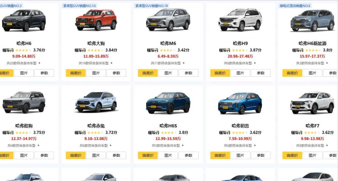 而长城在技术、品牌以及产品等各方面不占优势的情况下,追求单车利润的打法,比如哈弗H6新能源55km的需要16万,宋PLUS dmi 51km的是15.28万,这其实就是被比亚迪精准狙击了。