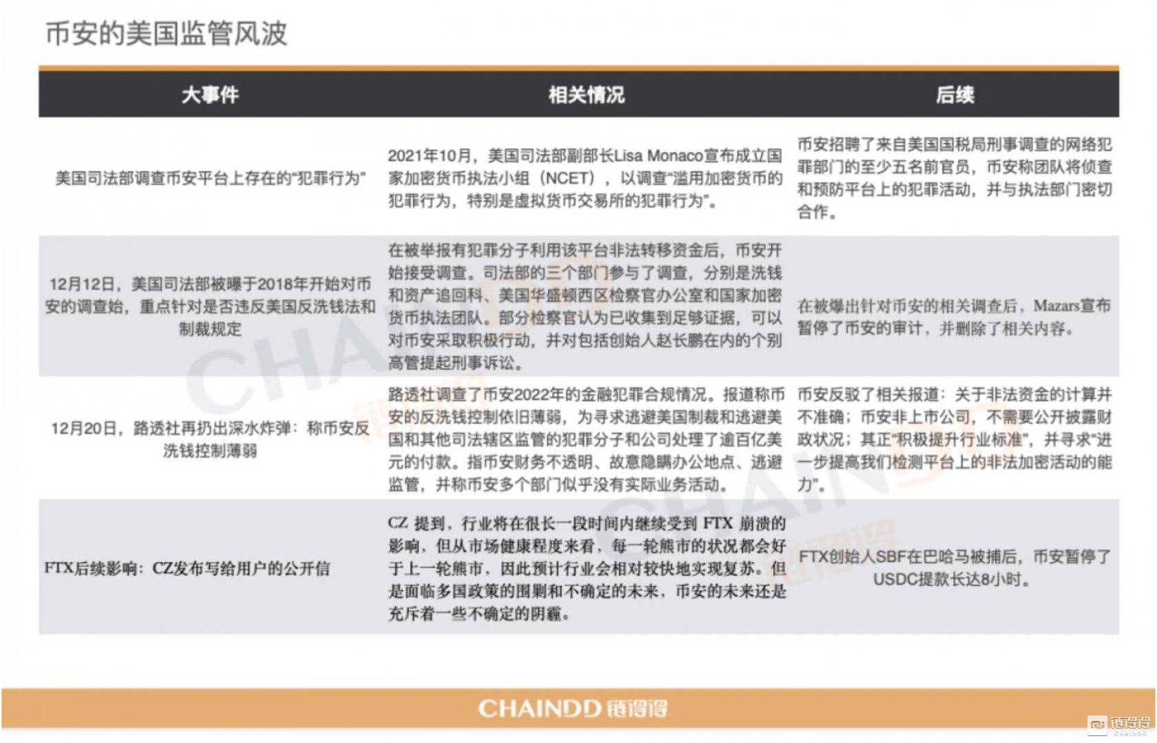 在2022年12月先后爆出美国司法部和路透社的调查取证,币安也在积极回应,反驳了相关报道,称关于非法资金的计算并不准确,币安不会挪用用户的资金去做任何的交易或投资,也没有任何借贷债务,也不在最近任何一家倒闭破产的公司债权人名单上。