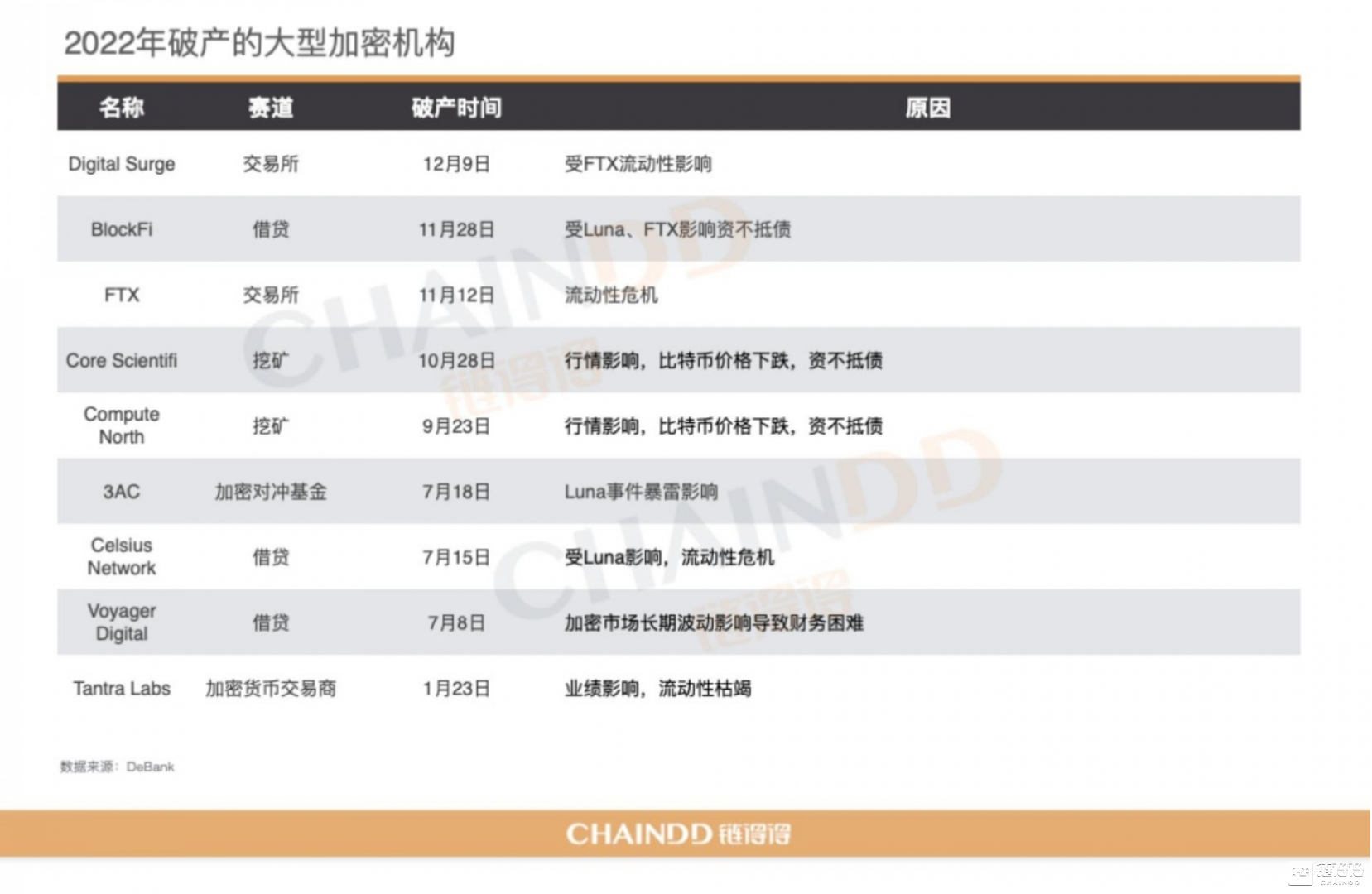 由于流动性的枯竭和市场行情的走低,众多企业倒在了2022年。在Voyager Digital Ltd和Celsius Network在Terra和Luna的崩盘动荡中破产后,加密货币贷款商BlockFi也在FTX崩盘两周后申请破产。据BlockFi提交的破产文件显示,其负债已接近100亿美元。