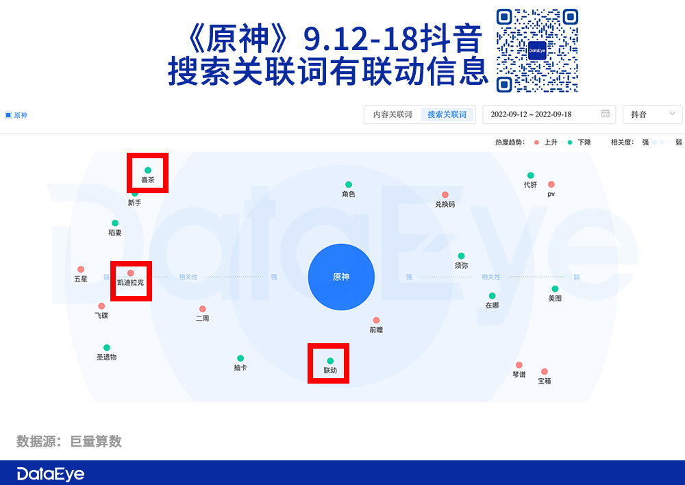 9月12号至18号这一周,是原神联动最疯狂的一周。抖音“原神”的搜索关联词中,“喜茶”、“凯迪拉克”、“联动”都在列;但内容关联词中,却没有“联动”或品牌关键词,更多的都是游戏本身相关词(数据源:巨量算数)——用户想了解,但相关内容却不多。