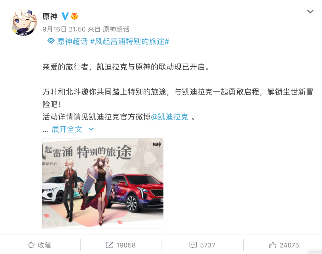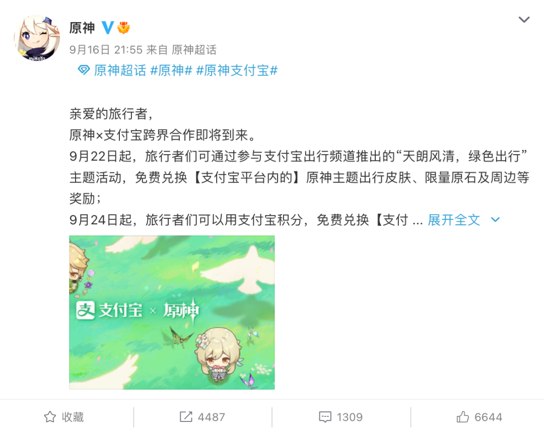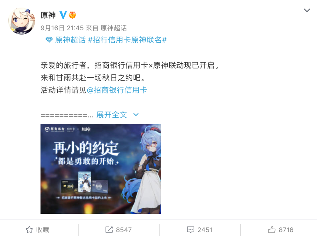 最疯狂当属9月16号当晚,@原神微博在10分钟内一口气发布了联动支付宝、凯迪拉克、招商银行信用卡的活动—— 一天联动三次****!