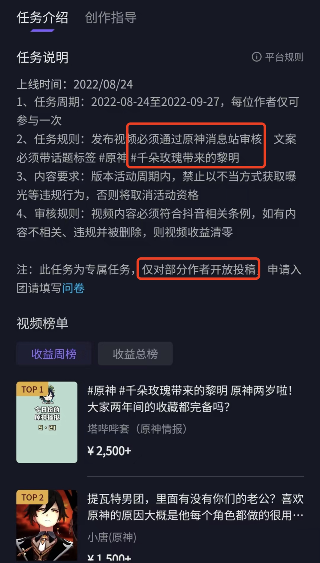 整体思路:《原神》在抖音游戏发行人计划的操作,可谓“非主流”:严格限制了征集的内容、达人。导致目前投稿达人仅22人,视频数也仅22条,传播量仅1640万。