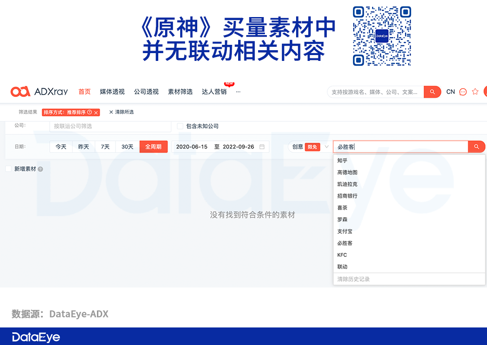 DataEye-ADX的创意搜索功能,并没有搜出“联动”、“必胜客”、“支付宝”等内容。反而是3.0版本“千朵玫瑰带来的黎明”相关素材较多。作为对比,《幻塔》等二次元游戏联动期间,往往同时投入相关素材进行买量。