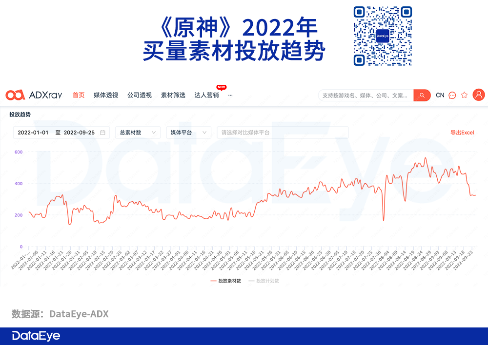 素材投放量:整个暑假,《原神》都加大了素材投放力度,买量素材小幅攀升,在二次元游戏中属于中等水平。其位列DataEye-ADX近90天中重度游戏中,二次元类的买量TOP13,低于TOP5的《崩坏3》。