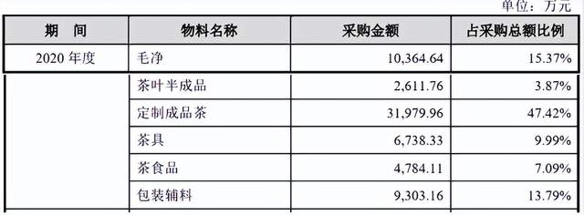 八马茶业采购规模最大的是定制成品茶,其次为毛净和包装辅料,采购金额分别达到3.2亿元、1.04亿元和0.93亿元。而所谓的定制成品茶,即为采购其他茶企的茶叶,贴上八马的牌子进行售卖,这很容易引发质量难控问题。
