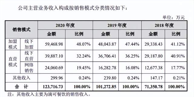 据招股书数据显示,2018年至2021年上半年,八马茶业的营收分别为7.19亿元、10.22亿元、12.47亿元、8.15亿元。虽然加盟店的数量是直营店的5倍多,但营收占比却不如直营店,其中加盟店营业额分别为2.93亿元、4.80亿元、5.95亿元、3.86亿元。