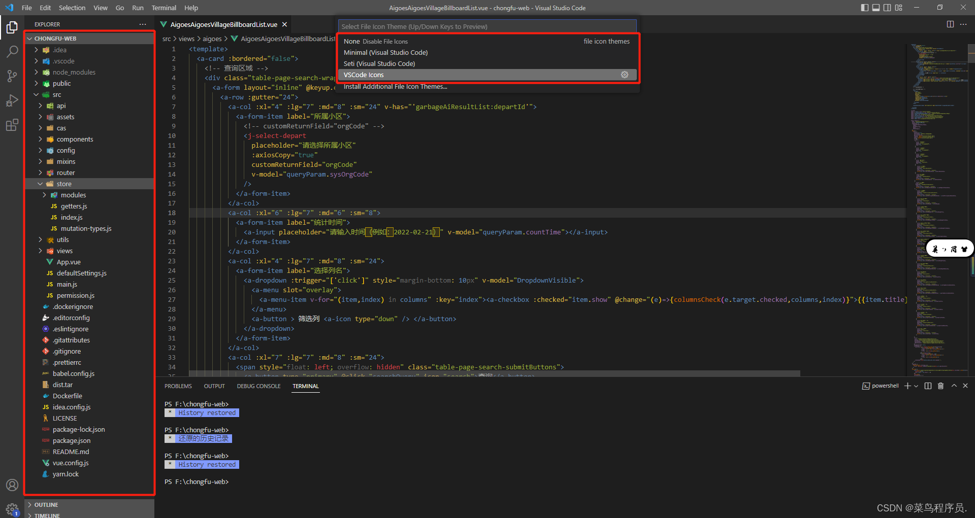 图标主题:Ctrl+shift +p 打开命令面板,输入 icon theme 后回车,选择一个即可。