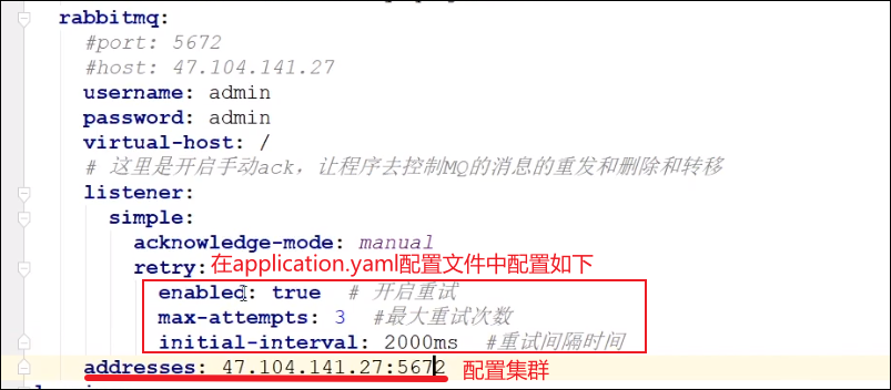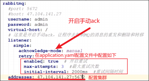 ①第一步首先要在yaml配置文件开启手动ack,这样消息在出现异常,甚至是超过重试次数的时候就不会被移除,我们还能将这条消息转移到死信队列中!