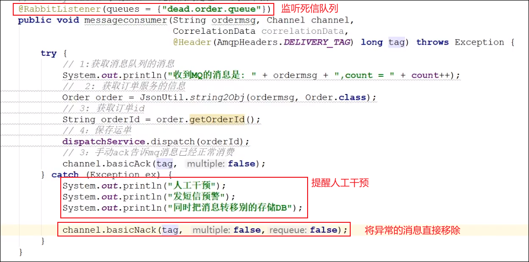 ②创建一个新的消费者来监听死信队列,这个消费者中的业务逻辑就不能包含处理异常消息的代码了,一般到了监听死信队列的情况下,再往后就得需要人工干预了!
