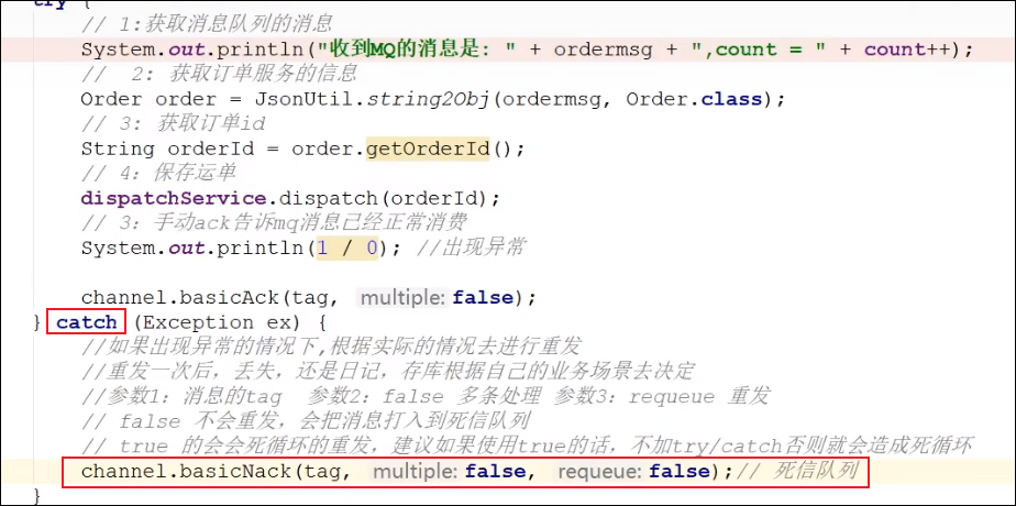 调用basicNack方法,参数requeue,如果设置成false,那么消息如果消异常,就会将他转移到死信队列中,如果设置成true,那么就会将这条消息移除掉