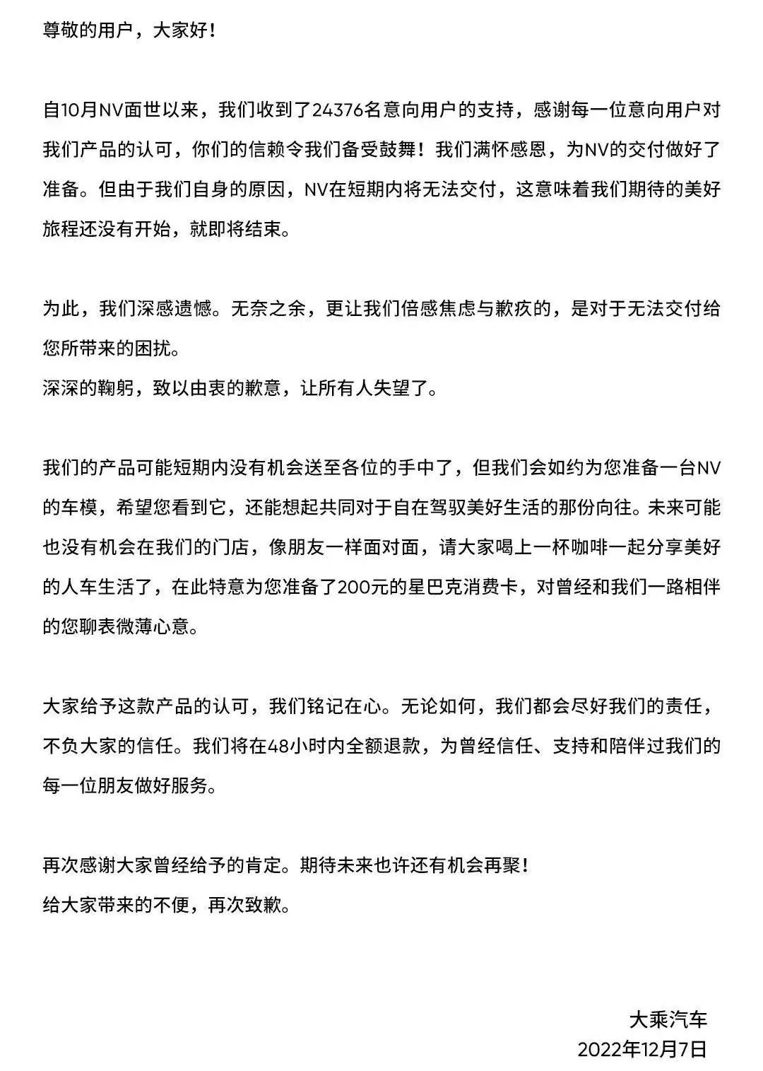 12月7日,自游家公众号发出了一封致用户的公开信,宣布首款新车自游家NV短期内将无法交付,官方决定将在48小时内为所有用户进行全额退款,并补偿每位用户一台NV车模及一张面值200元的星巴克卡。按照自游家的话来说,这意味着,一场美好的旅程还没有开始就即将结束。