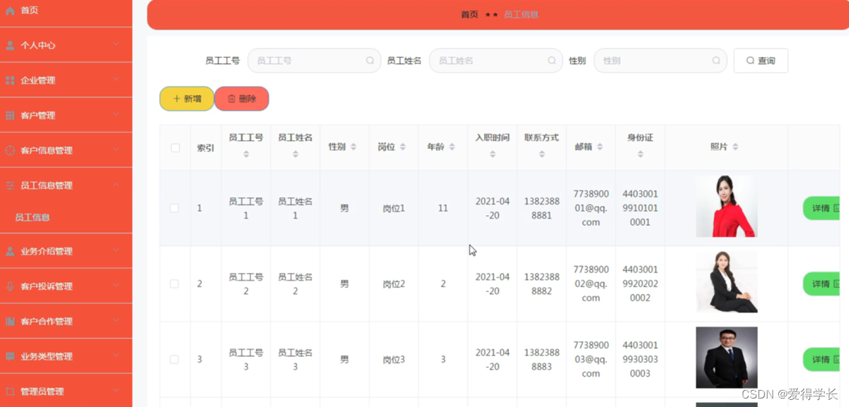 员工信息管理:在员工信息管理页面可以获取索引、员工工号、员工姓名、性别、岗位、年龄、入职时间、联系方式、邮箱、身份证、照片等信息,根据需要进行详情操作,如图5-11所示。