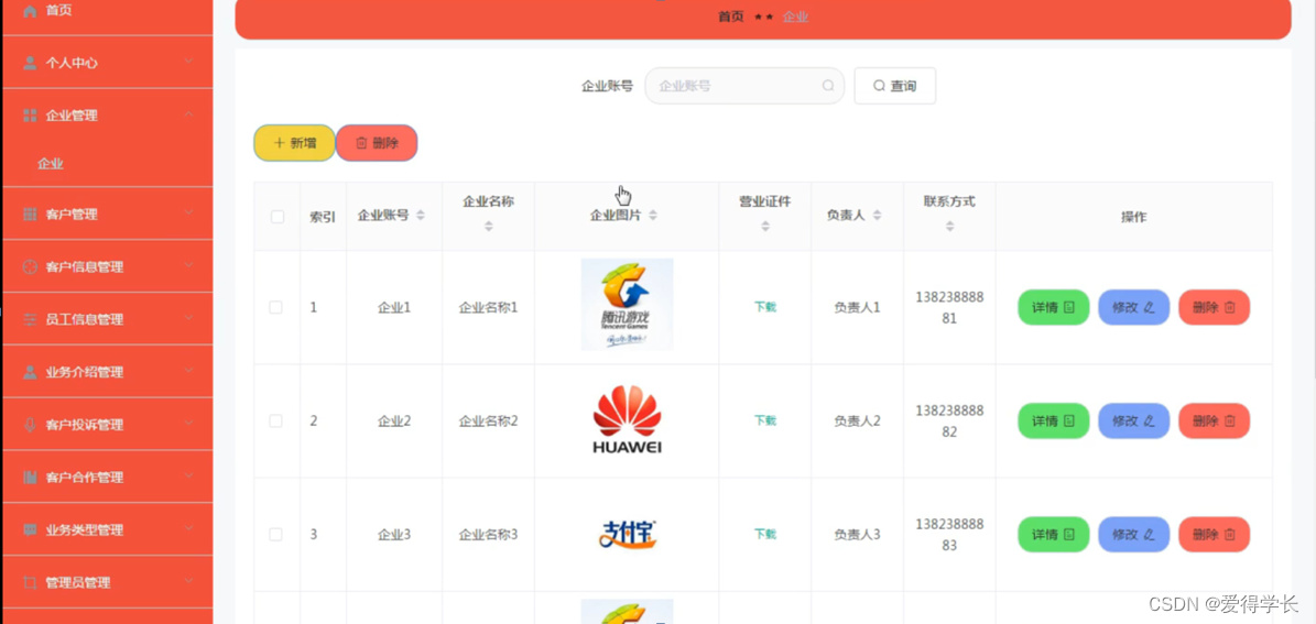 企业管理:在企业管理页面可以获取索引、企业账号、企业名称、企业图片、营业证件、负责人、联系方式等信息,根据需要进行详情、修改、删除等操作,如图5-8所示。
