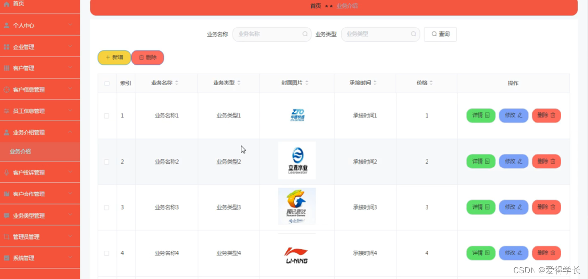 业务介绍管理:在业务介绍管理页面可以获取索引、业务名称、业务类型、封面图片、承接时间、价格等信息,根据需要进行详情、修改、删除等操作,如图5-12所示。