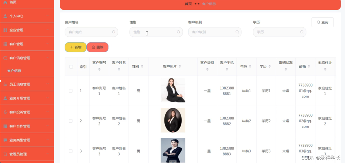 客户信息管理:在客户信息管理页面可以获取索引、客户账号、客户姓名、性别、客户照片、客户级别、客户手机、年龄、学历、婚姻状况、邮箱、家庭住址等信息,如图5-10所示。