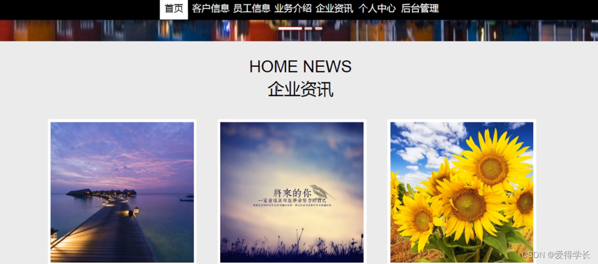 企业客户管理系统,在系统首页可以查看首页、客户信息、员工信息、业务介绍、企业资讯、个人中心、后台管理等信息,如图5-3所示。