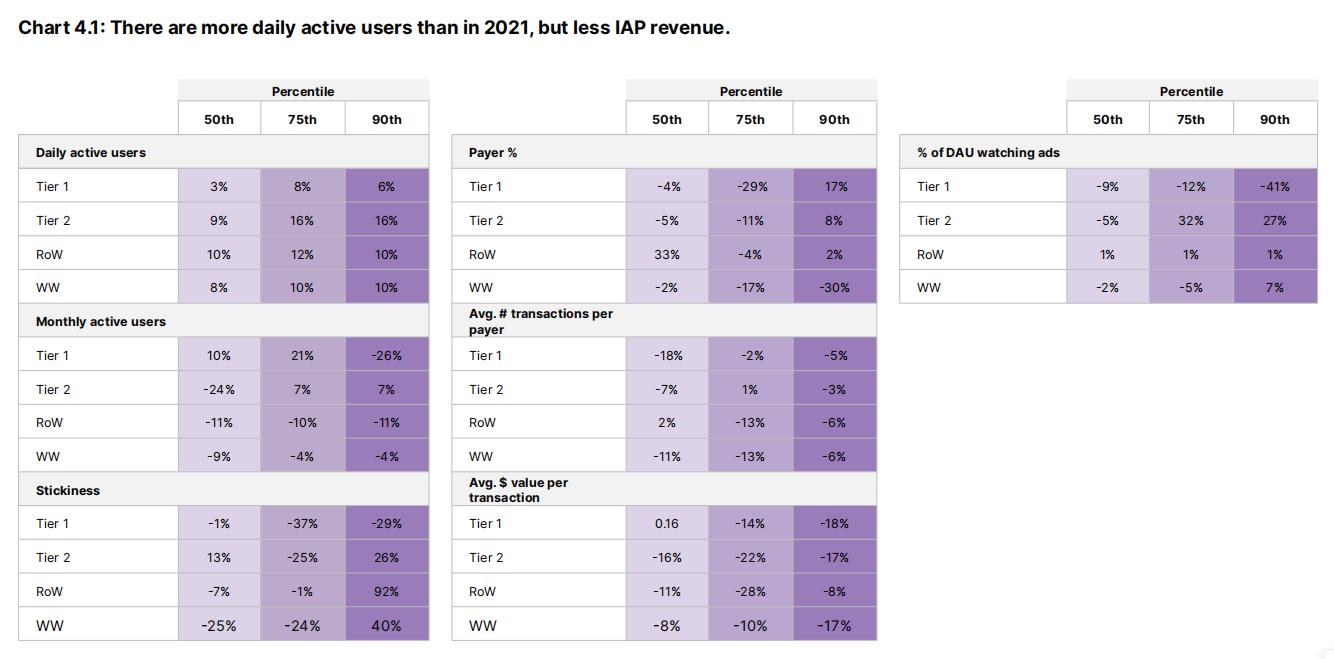 另一方面,如图所示,DAU超过1000划分T1地区中位数日活跃用户数(DAU)同比增长8%,但付费活跃用户下降了2%。(T1美国、加拿大、澳大利亚和英国,T2丹麦、瑞典、挪威、芬兰和爱尔兰)
