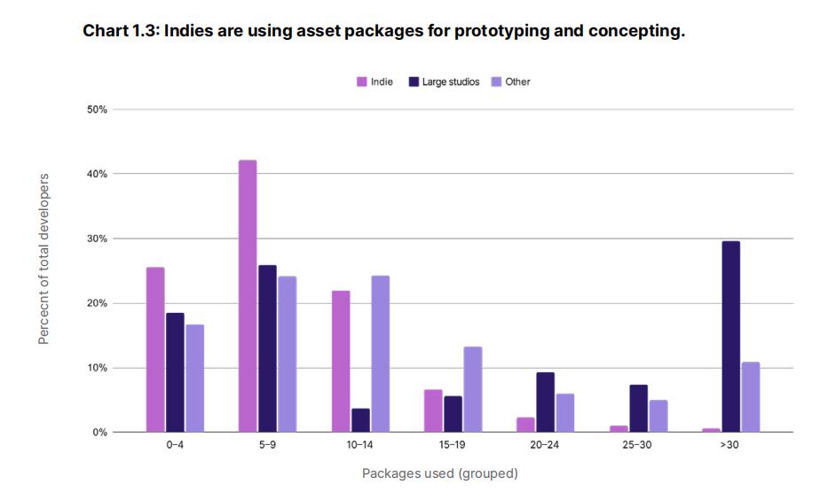 独立开发者不再从零开始开发每个项目。相反,他们将转向使用第三方资源快速进行原型设计和测试,62%的独立开发者在游戏中使用了5到14个资源包(assets)。46%的独立游戏原型设计阶段不超过一个月。