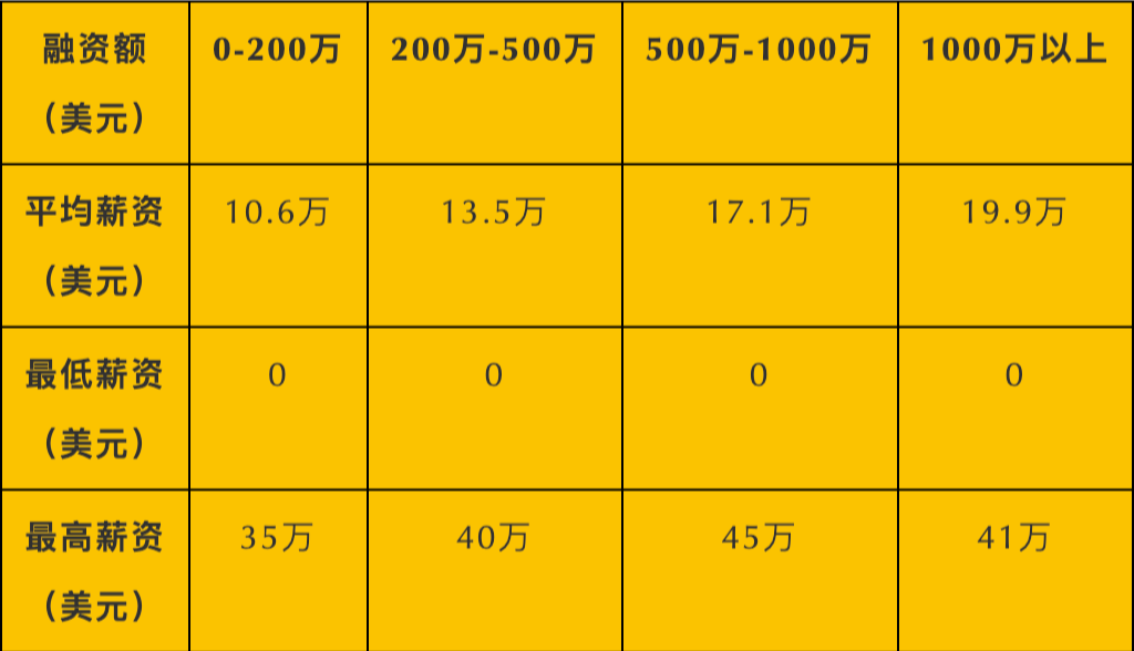筚路蓝缕的初创阶段,CEO平均薪资约为10.6万美元,而当公司融资超过1000万美元后,CEO的平均薪资也抬升到19.9万美元,几乎翻倍。