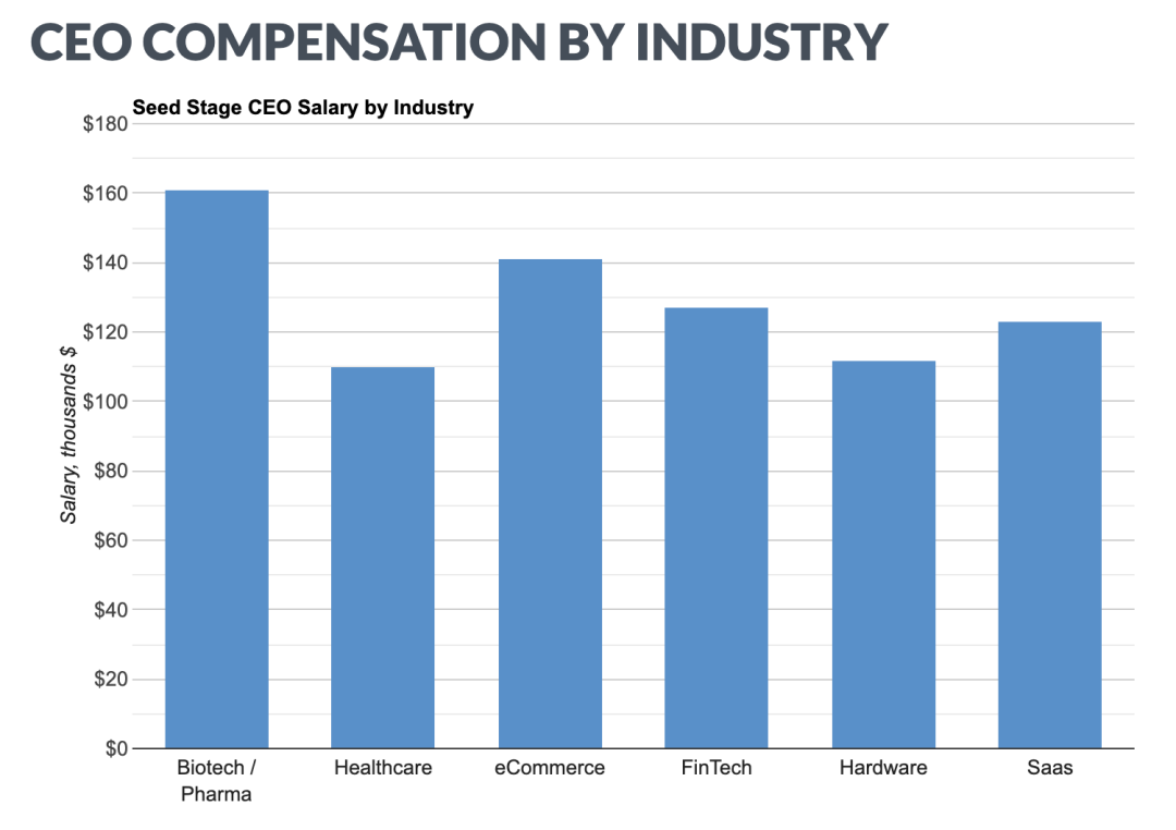 2022年,最贵的CEO来自生物医药行业,种子轮公司CEO的平均薪资高达16.1万美元。由于这类高精尖行业的CEO通常都有博士学位,VC也比较认可他们拿高薪。